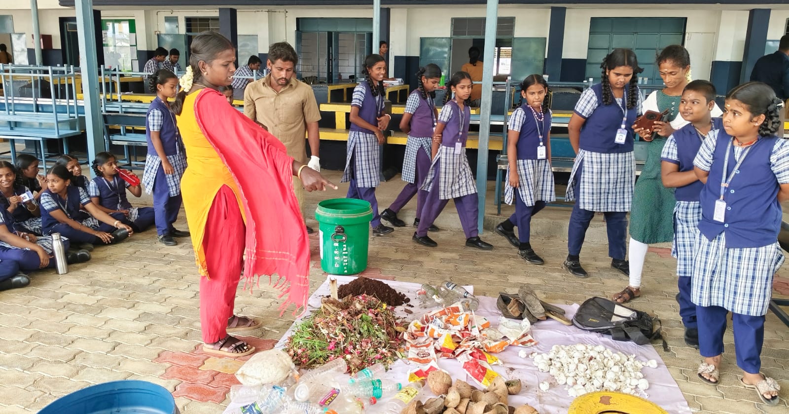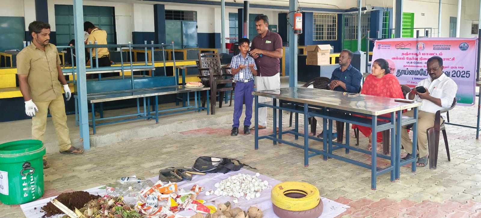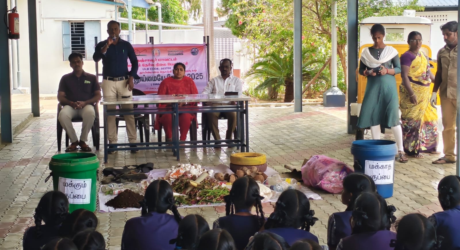 23.9. 2025 அன்று நம் பள்ளியில் வல்லம் பேரூராட்சியில் இருந்து சுகாதார பாதுகாப்பு முதன்மை அதிகாரி மற்றும் அலுவலர்கள் பள்ளிக்கு வருகை புரிந்து “தூய்மையே சேவை” என்ற தலைப்பில் மக்கும் குப்பை மற்றும் மக்காத குப்பைகளின் நன்மை மற்றும் தீமைகளை பற்றி மாணவர்களுக்கு விழிப்புணர்வு அளித்தனர்