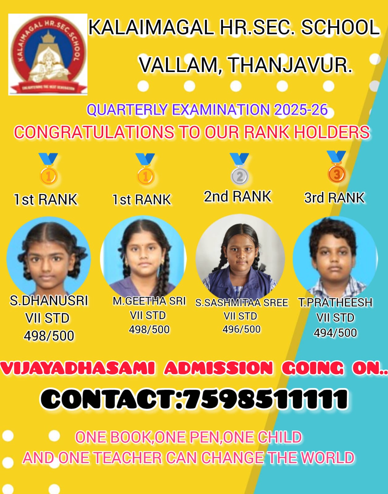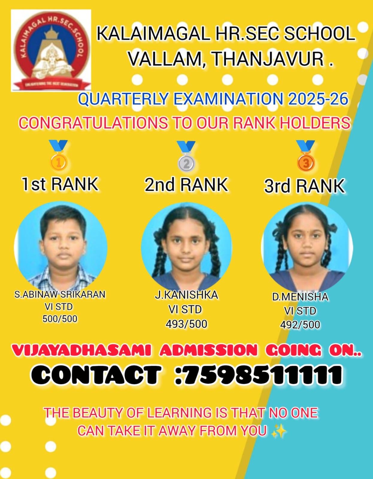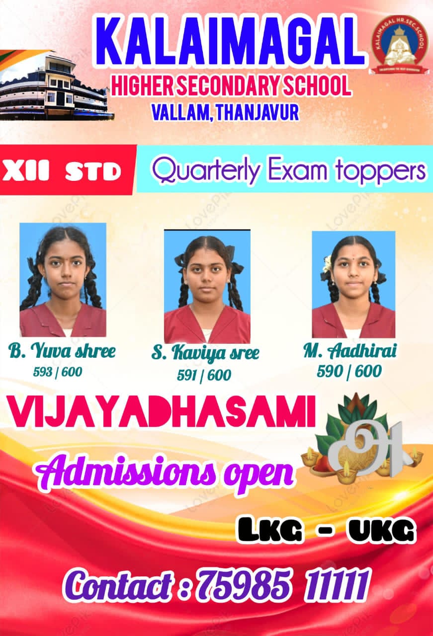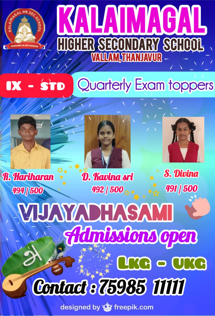 To prove that above quoted lines our kalaimagal students succeeded in the quarterly examination and achieved a centum in various subjects.
